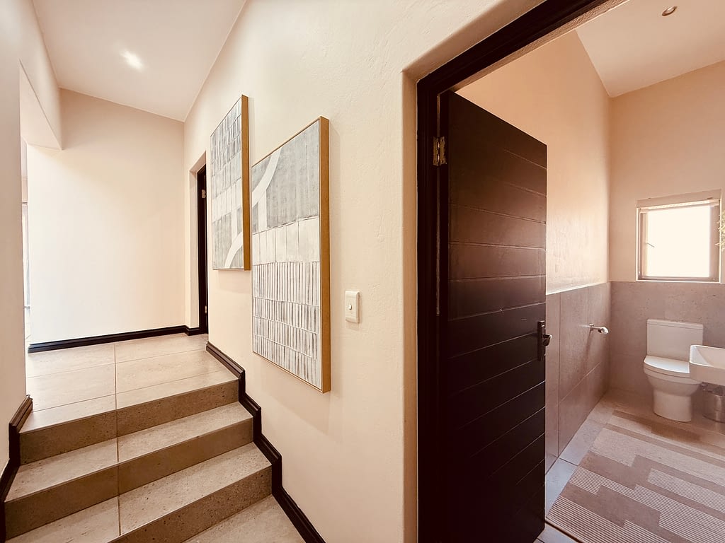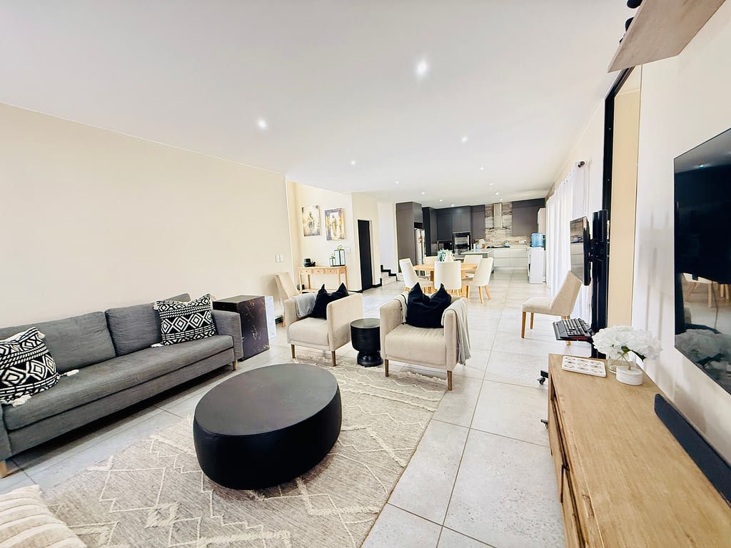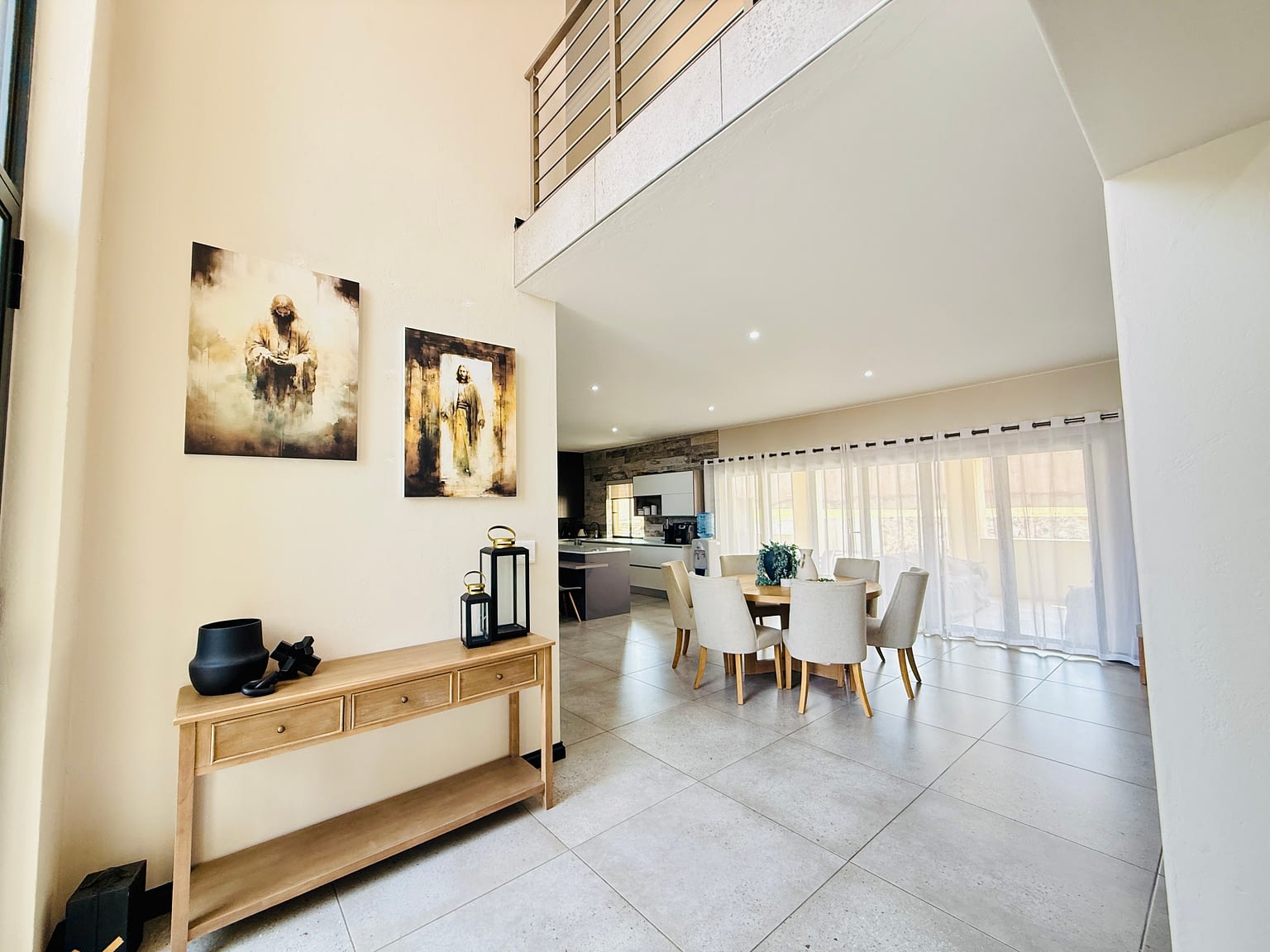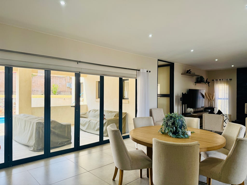 The interior of the home is defined by its open-plan layout, allowing for seamless transitions between living, dining, and outdoor spaces. Large sliding doors open onto an expansive patio, complete with a built-in braai and a sparkling swimming pool—an ideal setting for elegant entertaining or relaxed family gatherings. A separate reception area welcomes guests, while a private study or studio offers a quiet retreat for work or creativity. A stylish guest bathroom adds convenience.