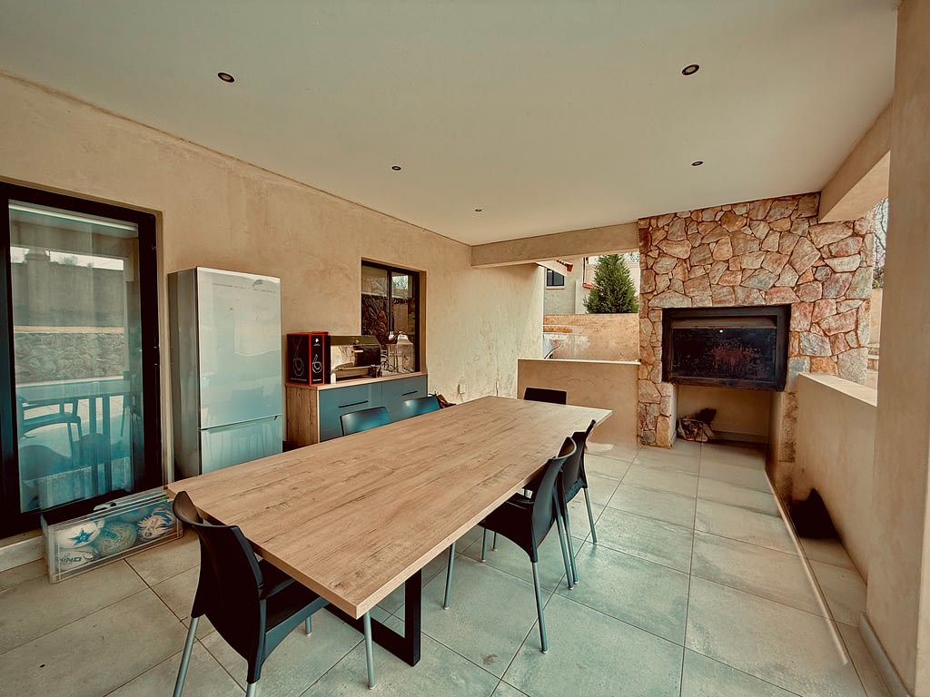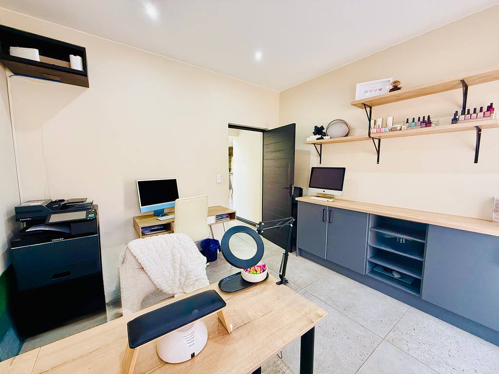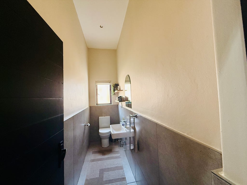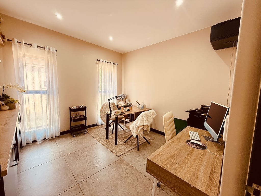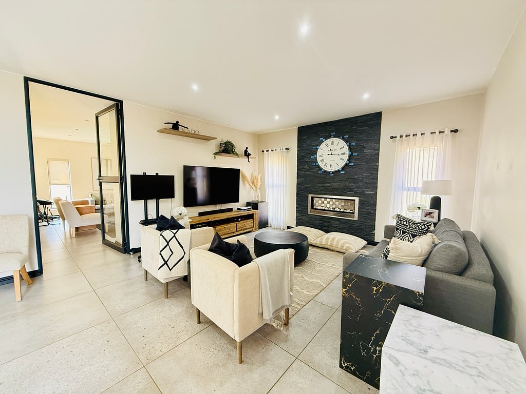 The interior of the home is defined by its open-plan layout, allowing for seamless transitions between living, dining, and outdoor spaces. Large sliding doors open onto an expansive patio, complete with a built-in braai and a sparkling swimming pool—an ideal setting for elegant entertaining or relaxed family gatherings. A separate reception area welcomes guests, while a private study or studio offers a quiet retreat for work or creativity. A stylish guest bathroom adds convenience.