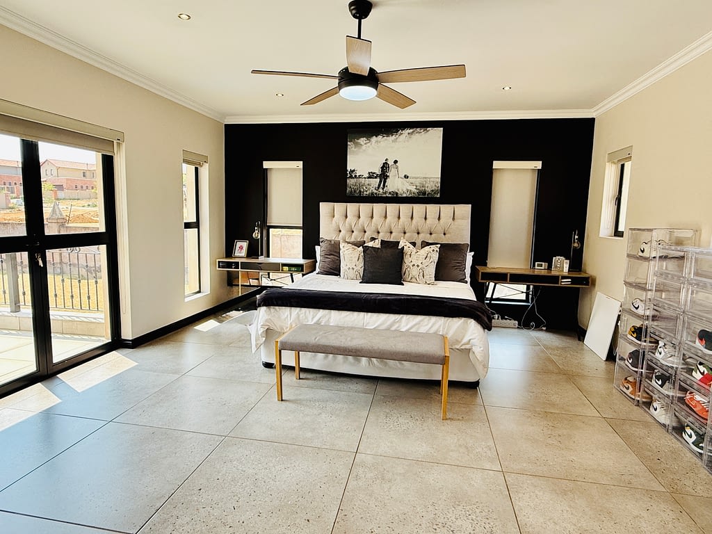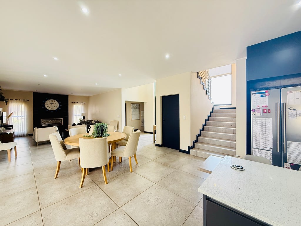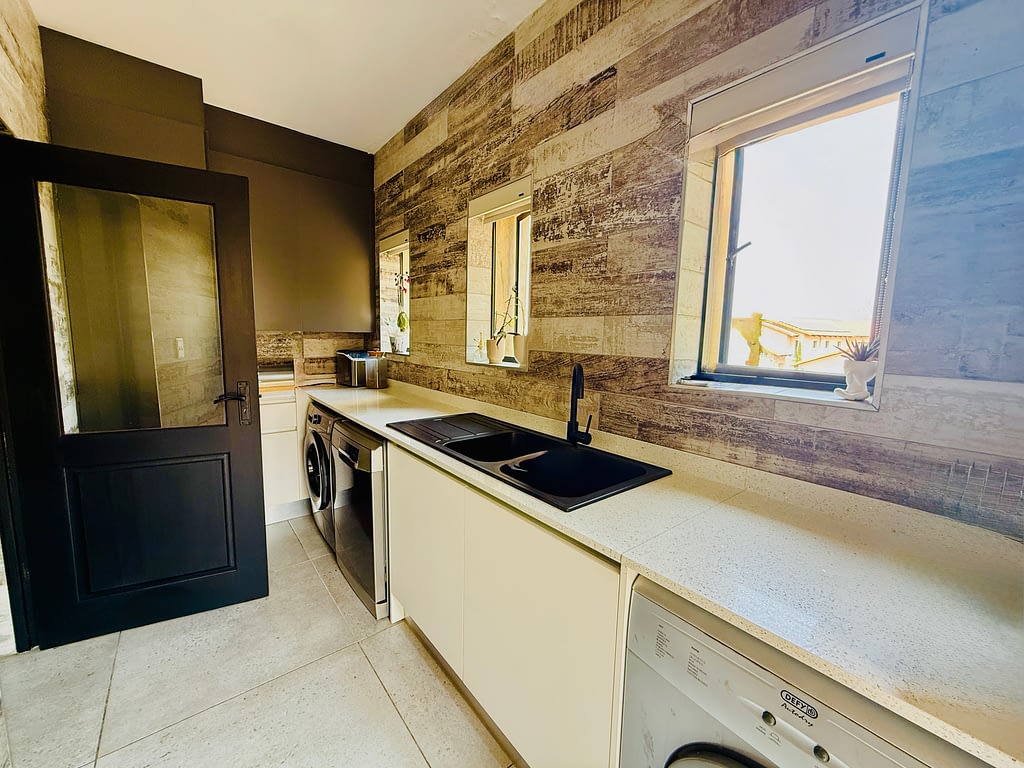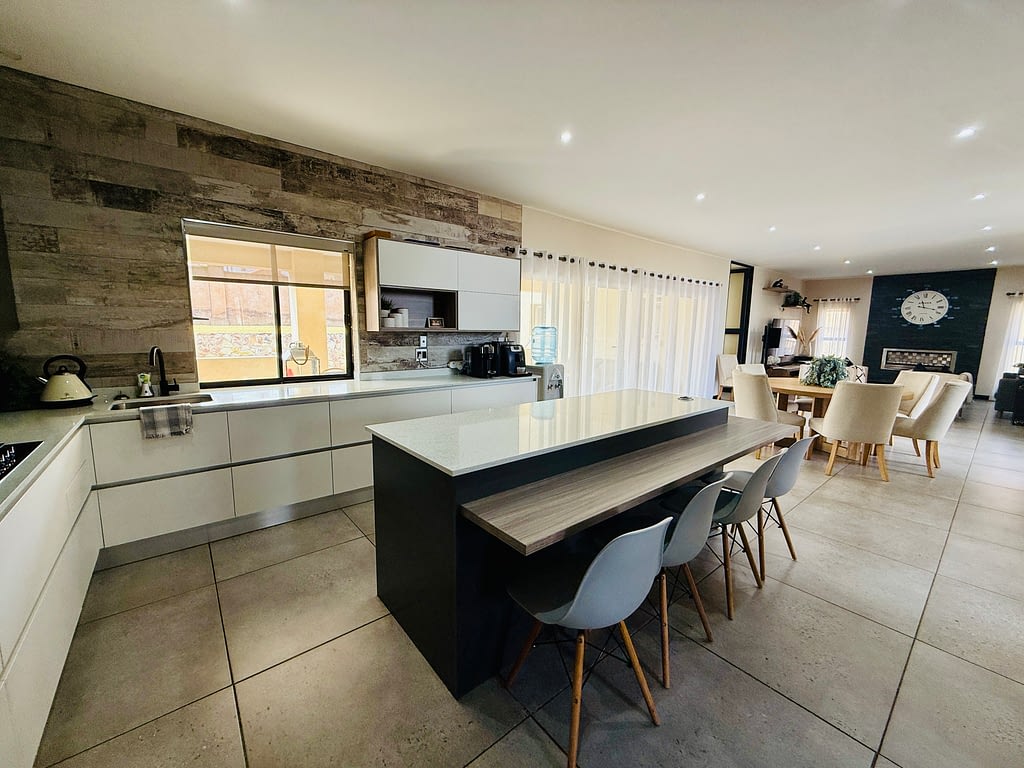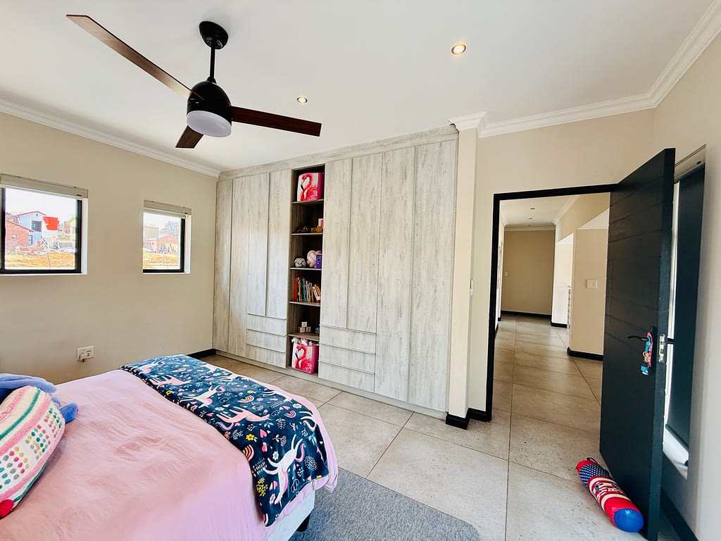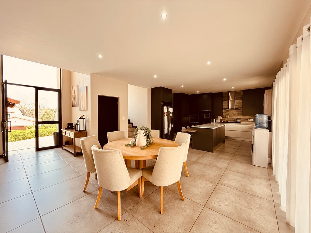 The kitchen is a chef’s dream, fitted with modern appliances, a central island for casual dining, and a separate scullery that leads to a private courtyard and domestic quarters. Every detail has been considered, from the custom cabinetry to the elegant light fittings and premium finishes throughout. The double garage features remote-controlled wooden doors and wall-to-wall built-in cupboards, ensuring generous storage space.
