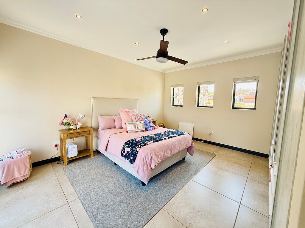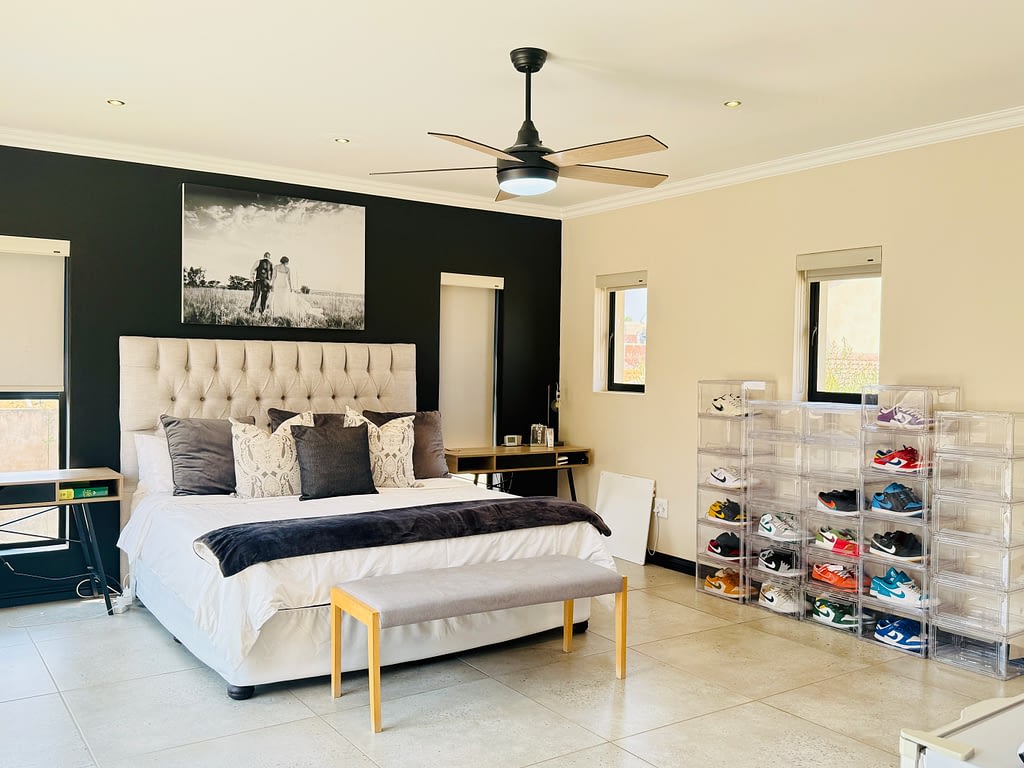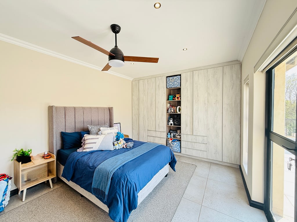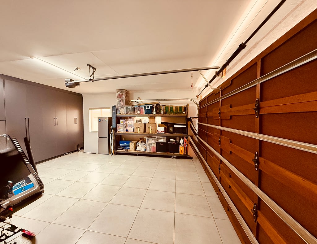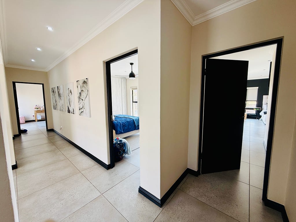 The kitchen is a chef’s dream, fitted with modern appliances, a central island for casual dining, and a separate scullery that leads to a private courtyard and domestic quarters. Every detail has been considered, from the custom cabinetry to the elegant light fittings and premium finishes throughout. The double garage features remote-controlled wooden doors and wall-to-wall built-in cupboards, ensuring generous storage space.