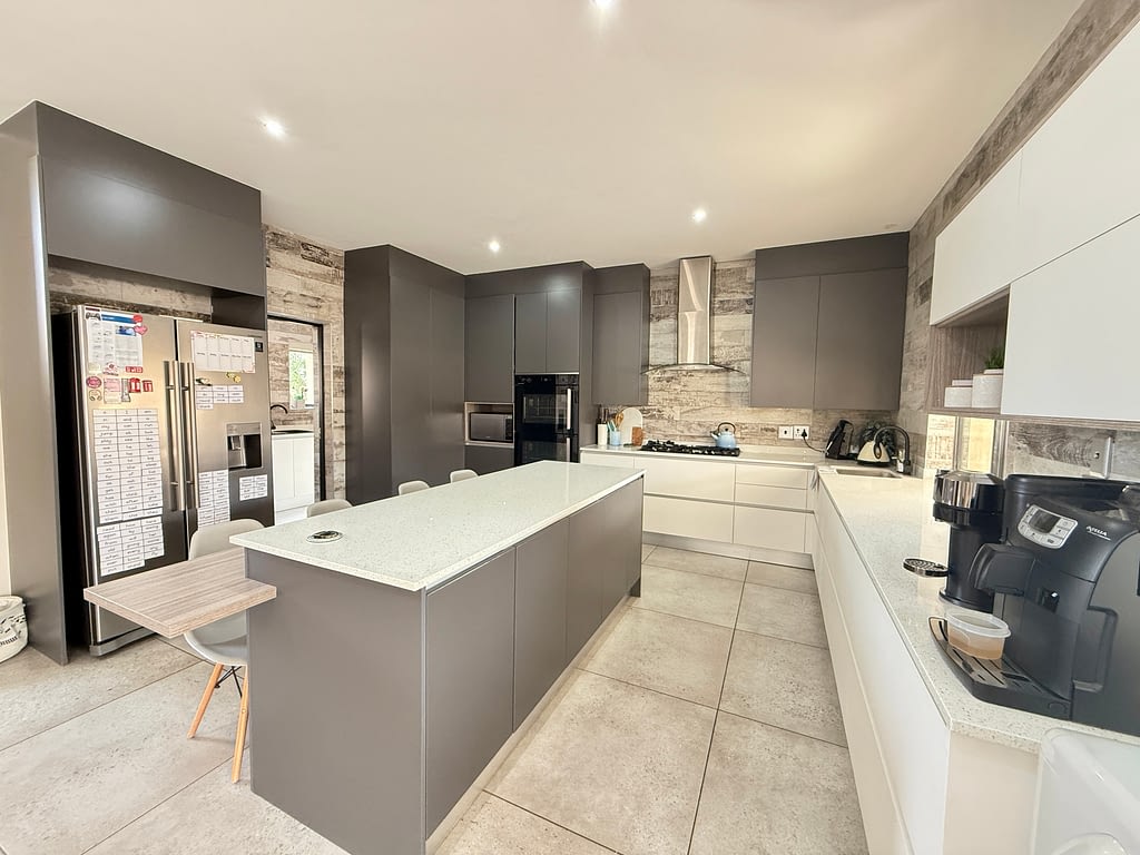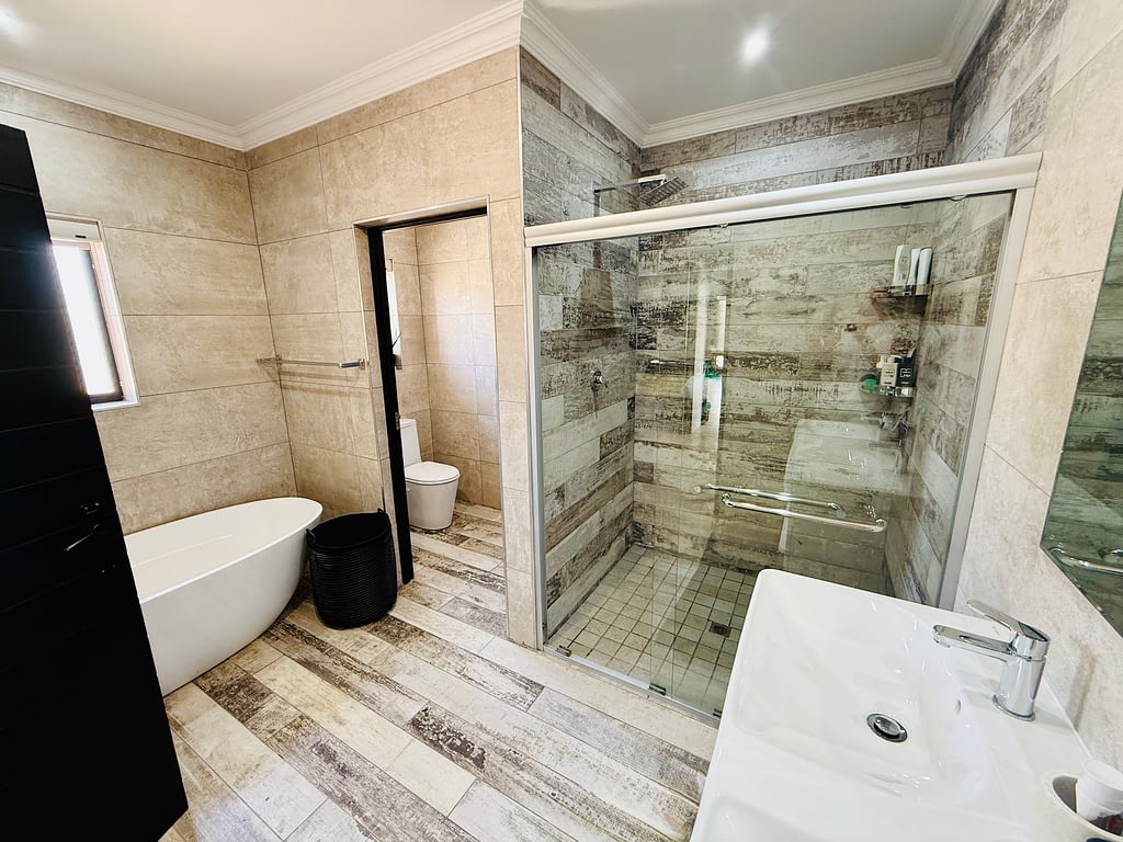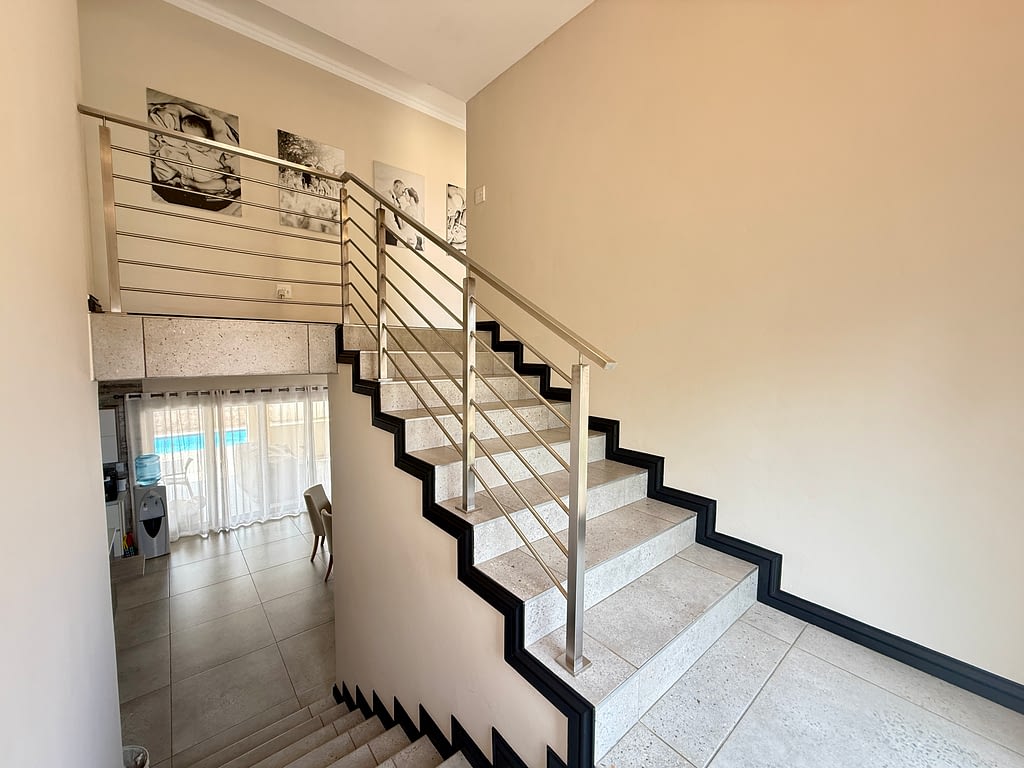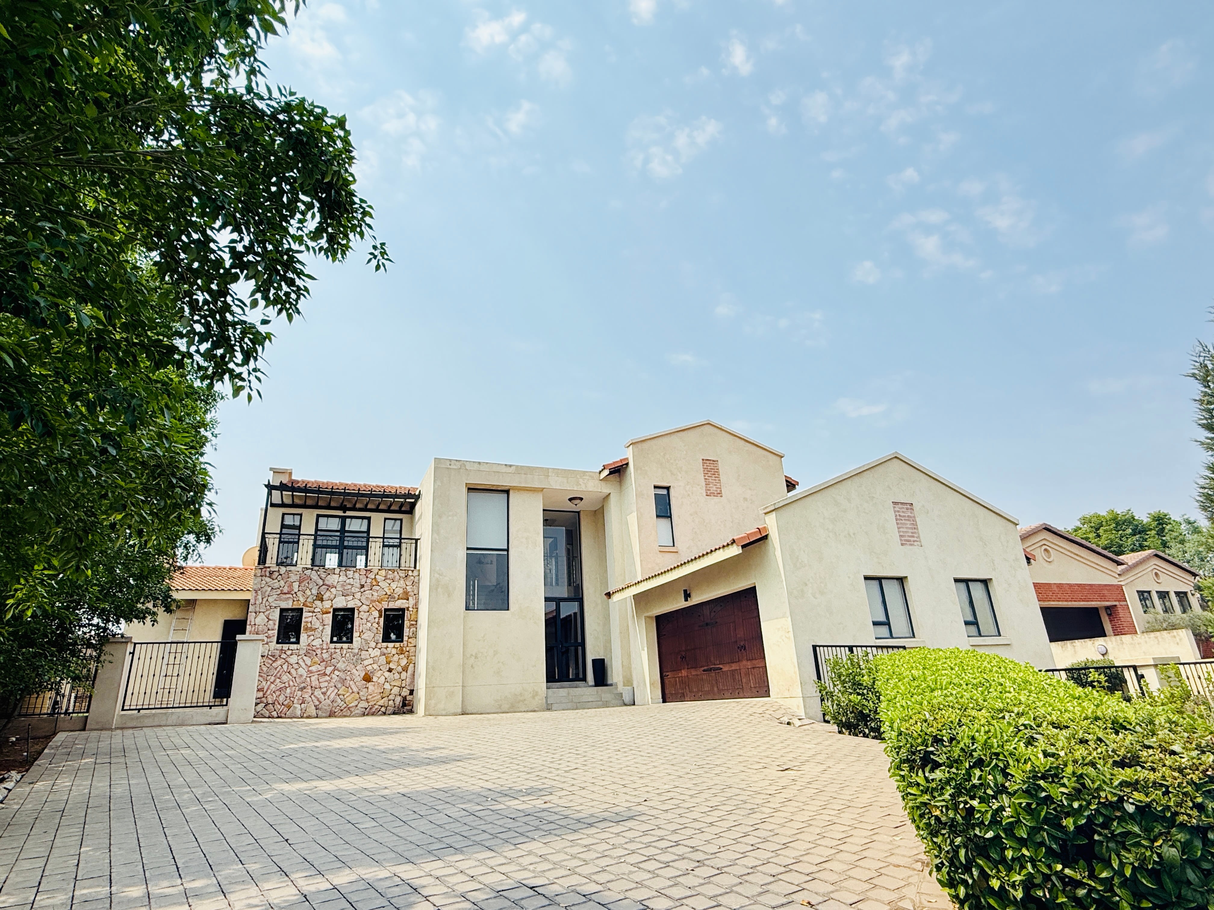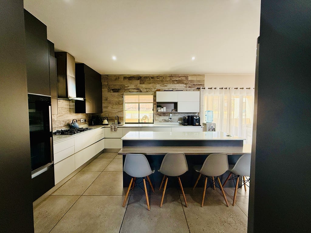 The kitchen is a chef’s dream, fitted with modern appliances, a central island for casual dining, and a separate scullery that leads to a private courtyard and domestic quarters. Every detail has been considered, from the custom cabinetry to the elegant light fittings and premium finishes throughout. The double garage features remote-controlled wooden doors and wall-to-wall built-in cupboards, ensuring generous storage space.