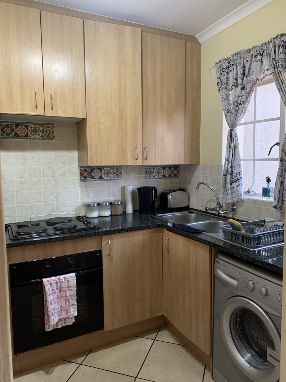 Modern kitchen with melamine cupboards and granite counter-tops.
